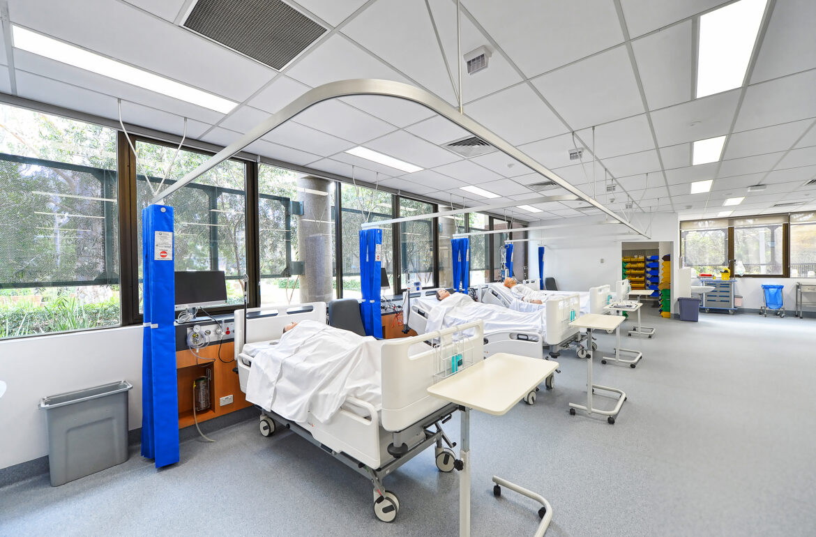 The works involved the selective demolition of outdated simulation labs, offices, and storage areas, making way for an updated floorplan accommodating additional hospital beds. Each new room received comprehensive service upgrades, including medical gases and nurse call systems, as well as new vinyl flooring, joinery, fixtures, beds, curtains, and fresh paintwork.